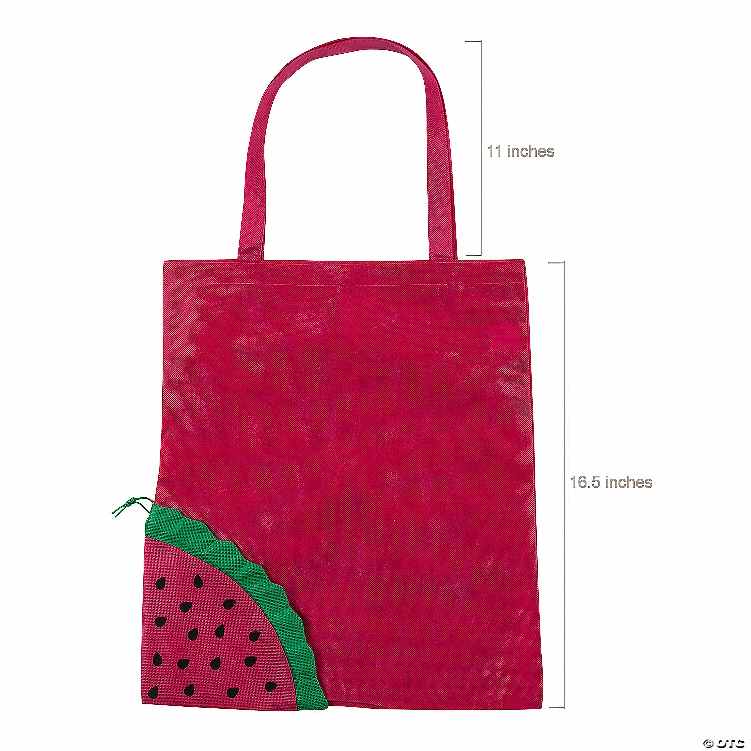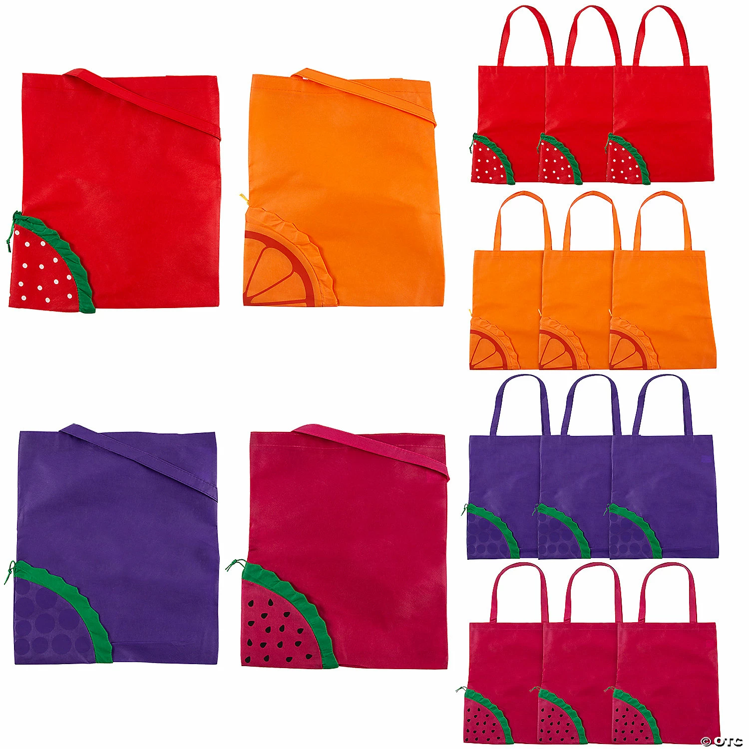 Are you looking for a bright addition to your party supplies? Perfect for filling to the top with all sorts of stuff, these Foldable Fruit Tote Bags fold into the fruit-shaped drawstring corner. Use them to fill with party favors at your next birthday party, office celebration, classroom party and more. Or, keep them for yourself and do your shopping in serious style. This eye-catching tote bag assortment includes orange, strawberry, watermelon and grape. Nonwoven polypropylene bags. 14 1/4″ x 16 1/2″ with 11″ handles. ยฉ OTC