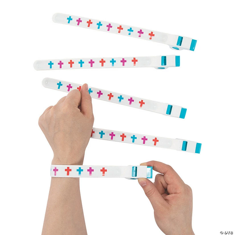 It’s like two toys in one! These Cross Whistle Slap Bracelets make excellent Easter basket stuffers, church event giveaways and so much more! Has colorful crosses printed on the slap bracelet and a white and blue whistle attached. Plastic. Bracelet, 7″; whistle, 3″.