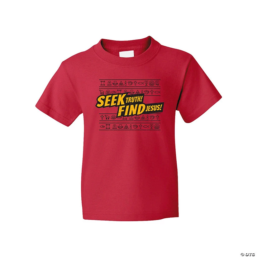 These graphic tees for kids are the perfect giveaway for a Dig Vacation Bible School theme! This red kid’s shirt features graphics you’ll find on VBS supplies throughout the theme and it is printed with “Seek Truth! Find Jesus!” Not just for VBS, this religious tee is a great everyday shirt, too. ยฉ OTCโข Brand: Fruit of the Loomโข Short sleeveโข 100% Cottonโข High-density fabricโข Tear away labelโข Double needle hemmed sleeves and bottomโข Seamless 1×1 rib collarโข Shoulder-to-shoulder tapingโข CPSIA compliant – all Fruit of the Loomยฎ youth products and packaging comply with the tracking label requirements of the Consumer Product Safety Improvement Act โข Need more? With our tees, we’ve got your back (and front)! To order in bulk for any size group, just call 1-877-513-0384. Or, give us a ring if youโd like to easily customize any of our pre-printed shirts with our free design service.