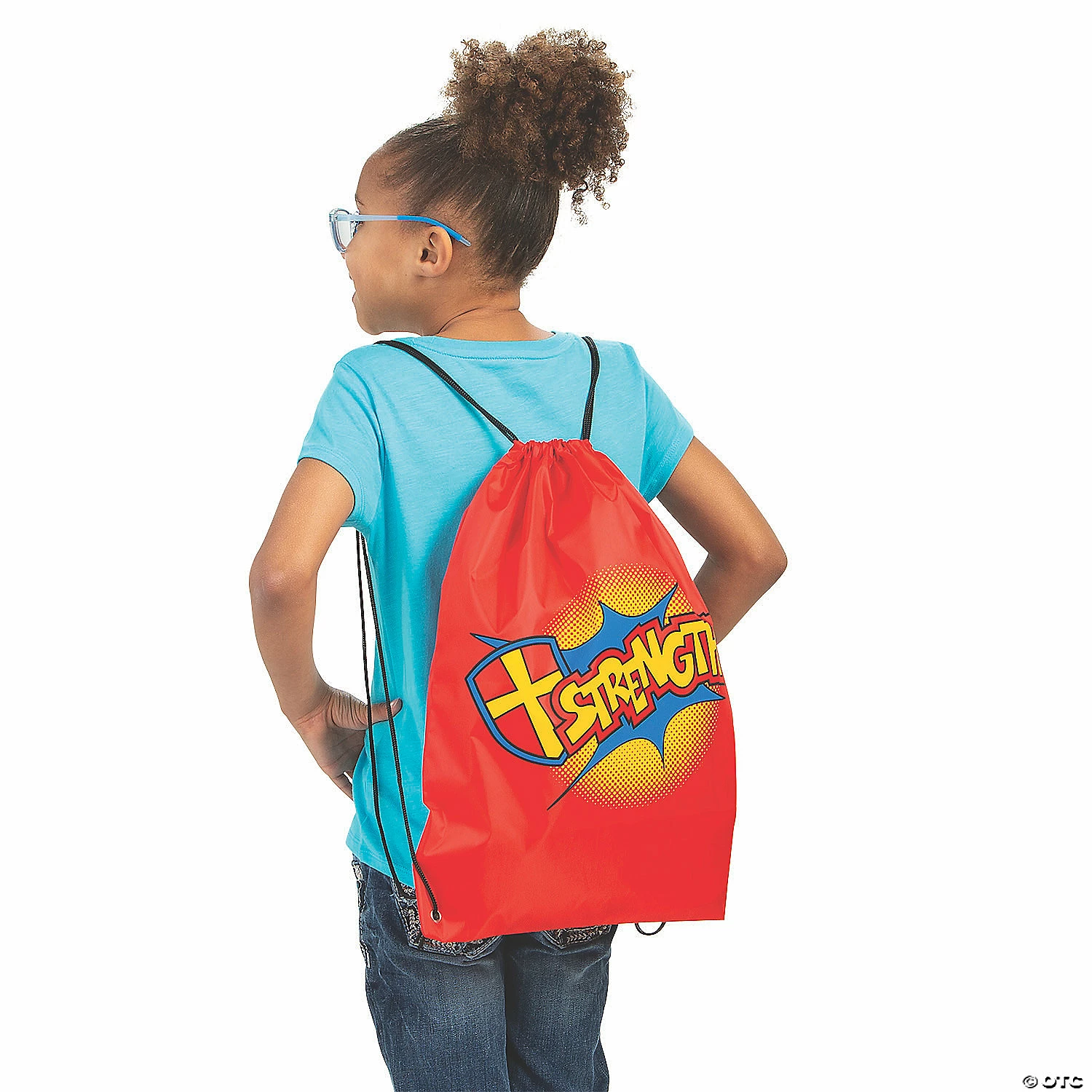 When you have your faith, who needs superheroes? These Fantastic Faith Drawstring Backpacks make excellent gifts for kids, teens and even adult comic book fans. These durable religious tote bags are perfect for toting groceries, books, clothes and more. Each bright bag features one of four inspirational words in a fun comic book-style design: โBelieveโ, โTrustโ, โPrayโ and โStrengthโ. Nonwoven polyester. 14″ x 17 1/2″ ยฉ OTC